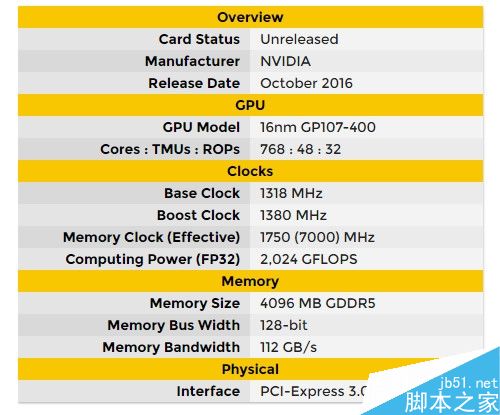 至于1050,這份爆料和之前一致,768個流處理器、48個紋理單元、32個ROP單元,核心頻率1318-1380MHz,顯存位寬128-bit、頻率7GHz、帶寬112GB/s,功耗不超過75W,最快10月24日上市(1040難道就50/60W?)。