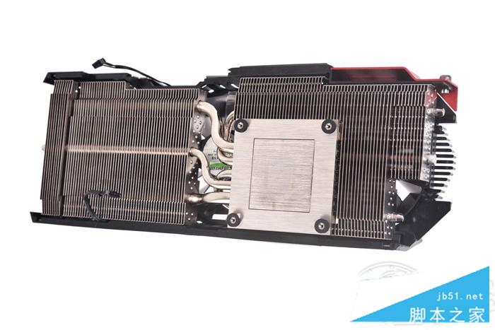 而在顯卡頂部,最突出的就是這個特殊的小散熱風(fēng)扇,風(fēng)扇橫跨了顯卡散熱器和后部的背板,看起來非常的小巧。顯卡背部采用了和前部散熱器相同的黑色金屬背板,金屬背板可以有效防止顯卡因為自身重量過重而導(dǎo)致彎曲的情況。加上這次的顯卡廣泛使用了輕質(zhì)的金屬材料,所以顯卡實際的重量比目測的要輕很多。