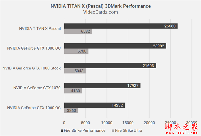FireStike得分中,Titan X得分26660,非公版GTX 1080、公版GTX 1080分別是23982、21603,Titan X性能分別高了11%、23%。