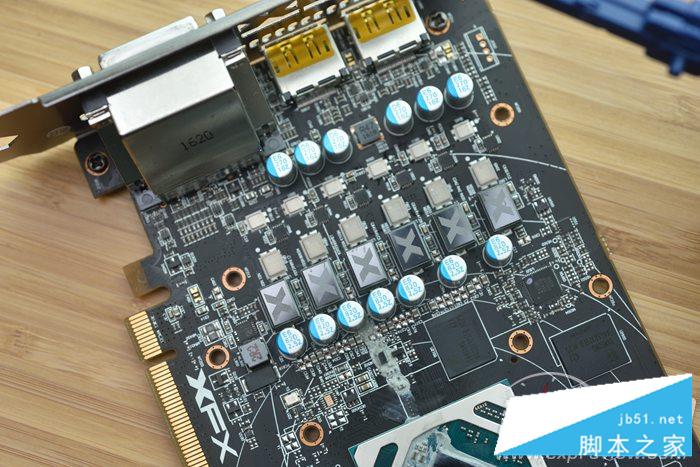 在顯卡核心左方的6相供電,每一相供電搭配了XFX定制的TrueX電感,該電感據XFX官方宣稱能大大減少電感嘯叫的情況。