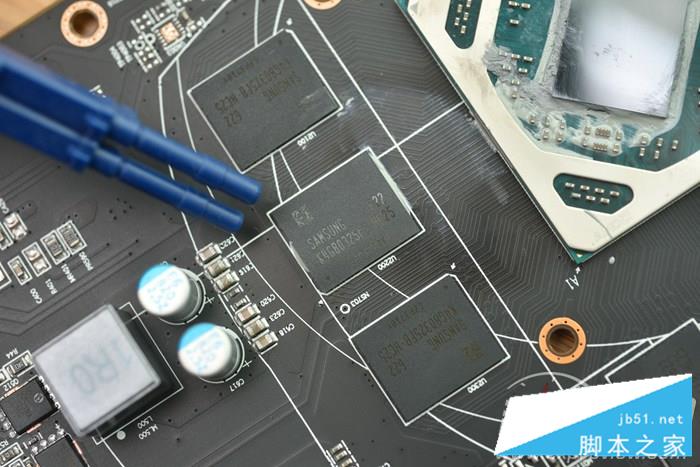 而在PCB上我們可以看到有一塊散熱片壓在核心四周,其實這塊散熱片也是獨立照顧顯存芯片的散熱,為我們以后的超頻打下堅實的基礎。