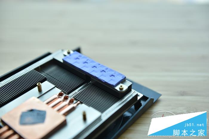 另外我們也可以看到散熱器上,右側有一塊藍色的導熱硅膠墊,這部分是負責顯卡核心供電的MOSFET散熱的,可以看得出第四代酷魂散熱器的設計,不僅僅只照顧到核心,就連核心供電的MOSFET也照顧到。