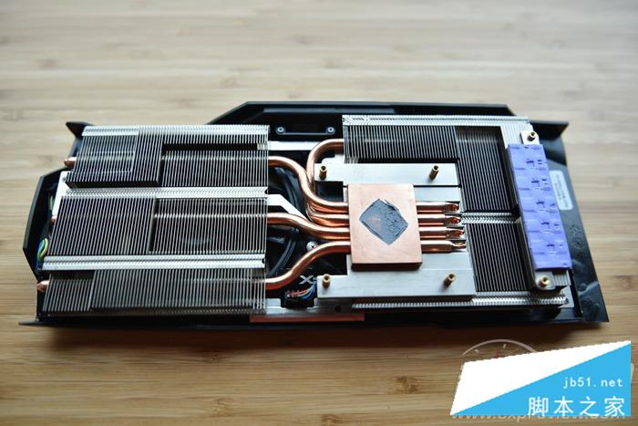 拆開散熱器后我們可以看到散熱器由4根8mm的熱管和大量散熱鰭片組成,4根銅管緊緊貼合著銅底,GPU核心的熱量經由銅底把熱量帶到4根熱管上,再由熱管把熱量帶給散熱鰭片,最后兩個90mm的風扇負責把熱量排走。