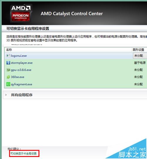 3、然后,在打開的ATI顯卡設置頁面中點擊底部的“可切換顯示卡全局設置”。