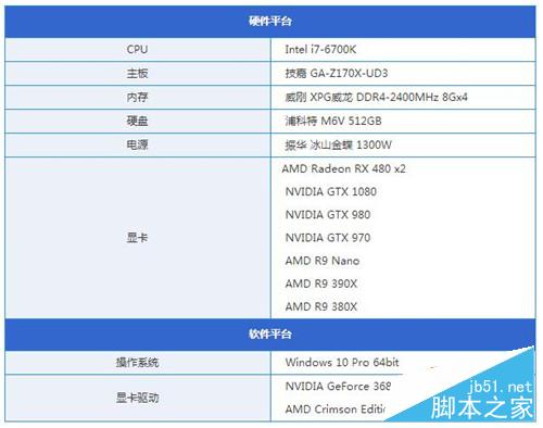 平臺(tái)說(shuō)明:測(cè)試平臺(tái)方面采用的是消費(fèi)級(jí)平臺(tái)Z170+6700K頂配,本次測(cè)試一共選用了7塊顯卡進(jìn)行對(duì)比測(cè)試,分別是AMDR9Nano、AMDR9390X8G、AMDR9380X、NVIDIAGTX1080、NVIDIAGTX980、NVIDIAGTX970各一片和兩片AMDRadeonRX480,驅(qū)動(dòng)方面為AMD內(nèi)部提供給我們的AMDCrimsonEdition16.6.2以及NVIDIAForceWare368.39WHQL。