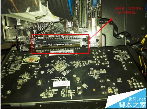 3、然后我們插新顯卡。如圖示,我們將顯卡的插條與主板上面的插槽對齊,然后慢慢插進去,在這過程中一定不要硬來。插進去的時候會聽到一聲很清脆的響聲。