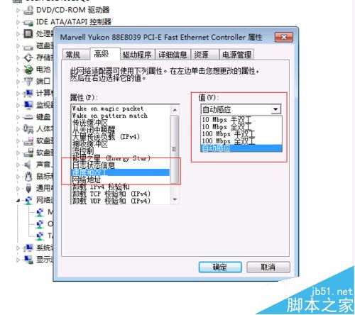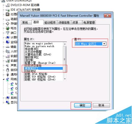 4、在網卡屬性的高級選項卡里單擊“速度和雙工”,然后在右邊的值里,選擇“100M bps全雙工”的選項,最后單擊確定。