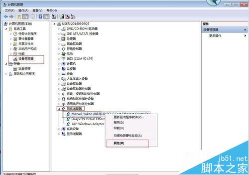 2、在彈出的計算機管理對話框中,依次點擊左邊的“設備管理”、“網絡適配器”,找到連網的網卡后右鍵點擊網卡,出來的菜單中左鍵點擊屬性。