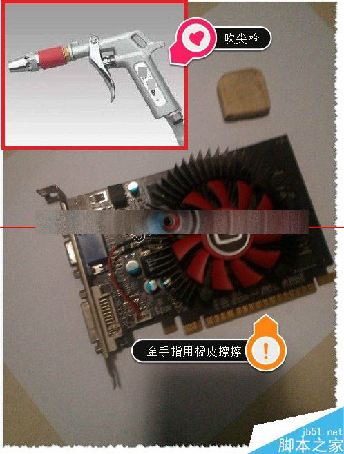 4、拆下顯卡,一般都是灰塵很多,很臟~~~可以用軟刷或沒(méi)用的牙刷清理一下。如果有吹塵槍可以用吹塵槍吹一下會(huì)非常干凈的~~~并把金手指用橡皮擦擦!如圖