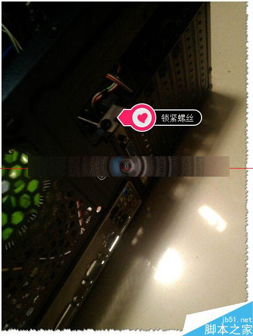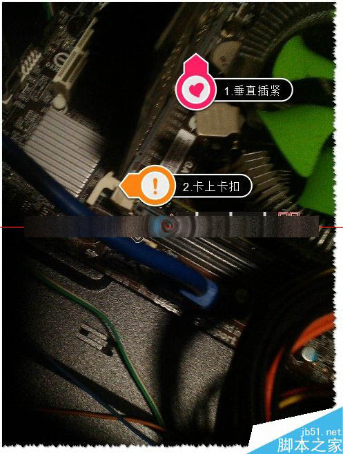 5、清理完成,安裝顯卡。卡槽的卡扣打開,顯卡垂直對(duì)準(zhǔn)卡槽插緊,扣上顯卡卡扣。如圖