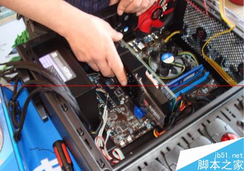 4、安裝顯卡時(shí),將顯卡平放并緩慢插入到專用顯卡插槽或PCI插槽中,此時(shí)需要注意金手指的接觸情況,確保PCI插槽和顯卡接觸良好。