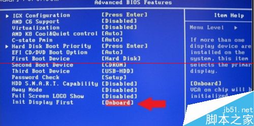 6、接著進(jìn)入CMOS,選擇“Advanced BIOS Features”(基本BIOS設(shè)置)界面,從中找到“Init Display First”項(xiàng),將右側(cè)的設(shè)置修改為非“主板”類型即可將電腦內(nèi)置顯卡關(guān)閉。如圖所示: