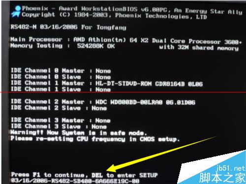 5、合上機(jī)箱后,打開(kāi)計(jì)算機(jī)電源開(kāi)機(jī),待出現(xiàn)第一屏幕畫(huà)面時(shí),按相應(yīng)的鍵進(jìn)入CMOS界面。