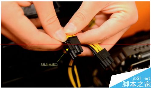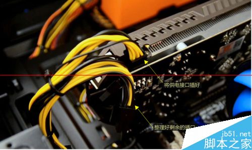 4. 將拆開的一個6孔顯卡供電插頭插入顯卡上的接口中,按緊;并將剩余的插頭整理好,以免影響機器內部整潔和美觀;
