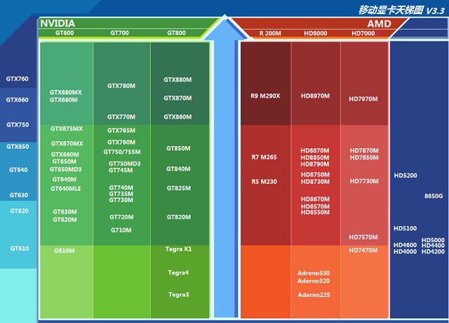 以上這張筆記本顯卡天梯圖2014主流版,主要包含時下相對比較主流的筆記本顯卡型號。