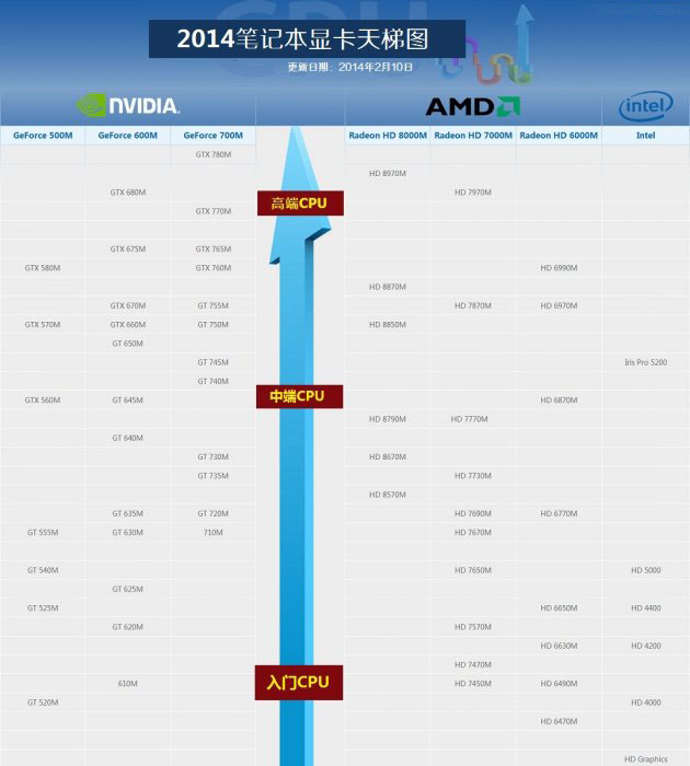 提示:以上筆記本顯卡天梯圖屬于2014年2月版,以上顯示的是略縮圖,看不清的朋友,請點擊圖片查看原始大圖。