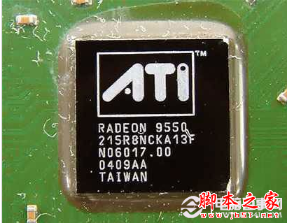 大部分的核心上都有代碼,不少芯片上直接能夠看出顯卡芯片的型號。如Radeon 9550核心的顯卡芯片,核心上的第一排就有Radeon 9550的字樣,我們可以很直觀地看出芯片的型號。不過也有的芯片只是標明了研發代碼,如nVIDIA的NV18、NV31,ATi的R340、R420等等,這些研發代碼表示不同型號的芯片。