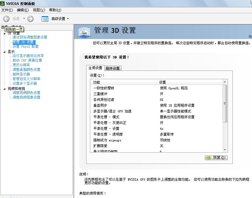 按照圖中第一步選中“管理3D設置”,然后看到框內如下情形: