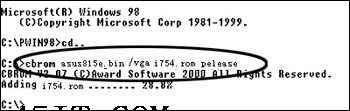 5、輸入Cbrom asus815e.bin /vga i754.rom pelease,刪除顯卡的BIOS信息(如圖2)。