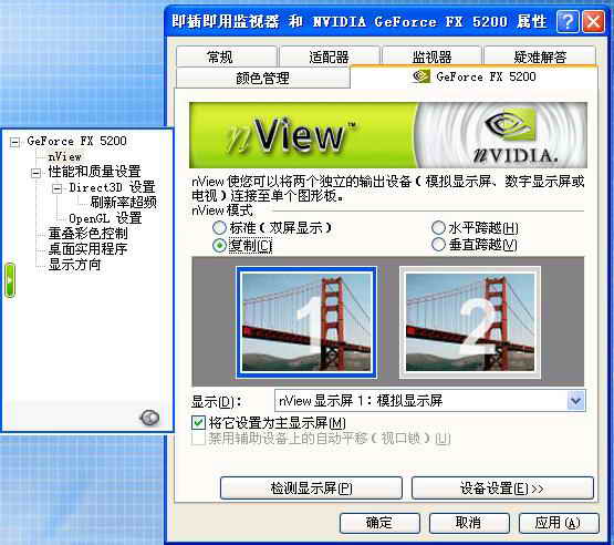 (注意:如果顯示卡和電視沒(méi)有正確連接,“復(fù)制”“水平跨越”“垂直跨越”選項(xiàng)將是灰色不可選)