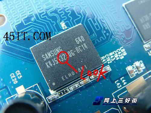 顯存的編號中都包含著什么呢?(比如下上圖中的K4J55323QG-BC14)這些數字和字母都代表著什么樣的意思呢?三星的顯存(別說你連三星都不認識,上面的SAMSUNG就是三星)要從編號的第4、5位數字來識別,圖中紅圈的地方是55,按照三星的顯存的規律,62、64=64Mbit、26、28=128Mbit、54、55、56=256Mbit。
