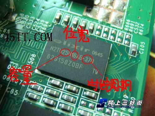 一般來說代表顯存容量的數字后面緊跟著的數字代表的就是顯存的位寬,上面兩顆顯存的位寬都是32Bit。知道了單顆的參數后就好辦啦,數數顯卡上一共有幾顆顯存吧,象上面這樣的顆粒如果有4顆的話,那么就是128Bit,8顆就是256Bit嘍。