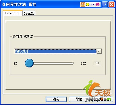 先用鼠標右鍵單擊一下系統(tǒng)桌面的空白區(qū)域,從隨后出現(xiàn)的右鍵菜單中執(zhí)行“屬性”命令,打開系統(tǒng)的顯示屬性設(shè)置界面;單擊該界面中的“設(shè)置”標簽,再單擊對應(yīng)標簽頁面中的“高級”按鈕,打開高級顯示屬性設(shè)置窗口,接下來單擊“ATI Direct3D”標簽,并在隨后出現(xiàn)的標簽頁面中單擊“各向異性過濾”按鈕,接著再單擊“Direct3D”標簽,并從該標簽頁面的“各向異性過濾”設(shè)置項處選中“始終為開”選項,然后將如圖3所示的滑動按鈕移動到合適的位置處。通常情況下,對于Radeon 9200型號或以下的低端顯卡來說,一般將“各向異性過濾”參數(shù)設(shè)置為2X,就能確保顯卡能為游戲或程序提供更為清爽的材質(zhì)效果或更為精致的貼圖表現(xiàn);如果我們當前玩的游戲比較老的話,也可以嘗試著將“各向異性過濾”參數(shù)設(shè)置為4X,以便加強游戲畫面的顯示效果;對于Radeon 9500型號或以上的中高端顯卡來說,我們往往可以將“各向異性過濾”參數(shù)設(shè)置為8X或16X。當然我們不能一味地為追求過高倍數(shù)的各向異性過濾,因為實踐表明將“各向異性過濾”參數(shù)設(shè)置得過高,反而會降低畫面的顯示質(zhì)量,導(dǎo)致畫面看上去不是非常逼真、清爽。