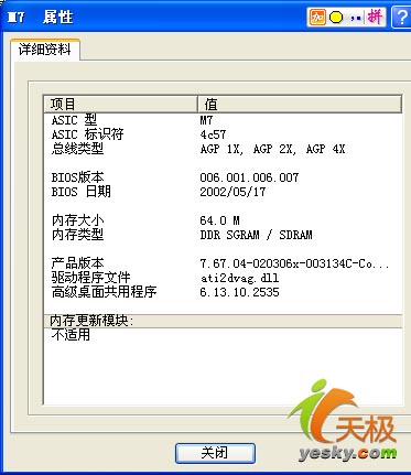 先用鼠標右鍵單擊一下系統(tǒng)桌面的空白區(qū)域,從隨后出現(xiàn)的右鍵菜單中執(zhí)行“屬性”命令,打開系統(tǒng)的顯示屬性設(shè)置界面;單擊該界面中的“設(shè)置”標簽,再單擊對應(yīng)標簽頁面中的“高級”按鈕,打開高級顯示屬性設(shè)置窗口,接下來單擊“ATI選項”標簽,并在對應(yīng)標簽頁面的“版本信息”中單擊“詳細資料”按鈕,隨后系統(tǒng)將打開如圖2所示的信息顯示頁面。從該顯示頁面中我們不難看出,筆者使用的ATI顯卡內(nèi)存大小為64MB,顯卡內(nèi)存類型為DDR SGRAM/SDRAM,顯示卡的驅(qū)動文件為“ati2dvag.dll”,顯卡的BIOS版本為“006.001.006.007”。