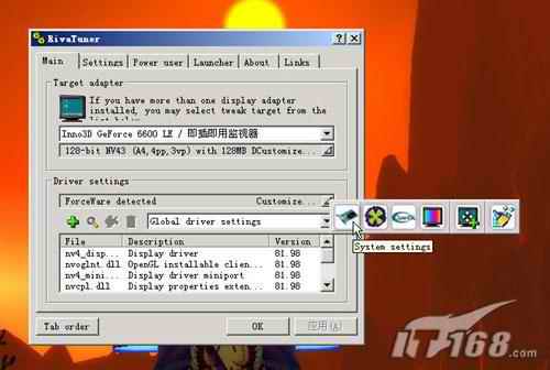 為了更加直觀地了解顯卡的核心頻率和顯存頻率,以及嘗試對它們進(jìn)行超頻,這里單獨(dú)對它們進(jìn)行檢測。這里必須講清楚,顯卡超頻不同于CPU,超頻幅度太大很容易對顯卡造成永久性的物理傷害,通常是燒掉核心或者是顯存,因此大家在這個問題上面的處理一定要慎重。同樣是使用“RivaTuner”,如圖所示,在“Driver settings”那里選擇第一項(xiàng)“System settings”,然后就可以進(jìn)入相關(guān)的操作界面。