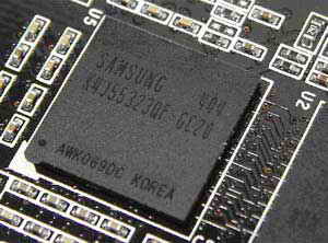 因此,早期GDDR2顯存的頻率并不是很高,頻率在266/333/400/500MHz(等效于533MHz/666MHz/800MHz/1GHz),而且早期GDDR2的CL值在6/7/8之間,因此性能并不比高規格的mBGA DDR顯存強多少。不過,后期隨著生產工藝的改良,GDDR2以上缺點有所緩解,比如最新GDDR2的工作電壓已經從最初的2.5V降到了1.8V,發熱量大大降低,而且GDDR2的CL值也降到了3/4/5,頻率及性能都有了改善。