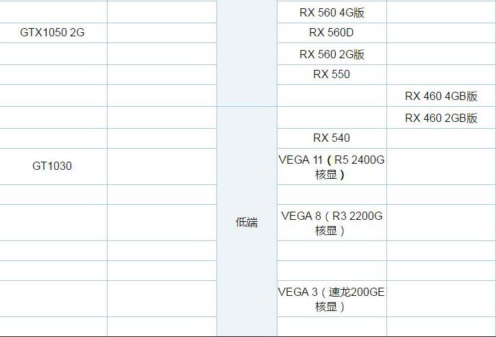 低端顯卡:VEGA 11/8/3(AMD APU處理器核顯),可用于玩LOL、Cf、守望先鋒等輕量級3D網(wǎng)游,老電腦用戶,也可以考慮GTX1030;