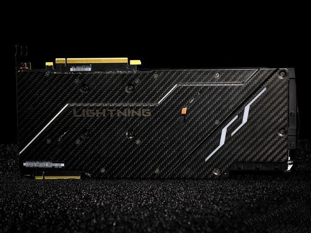 顯卡正面,碳纖維加黃色配色給人非常霸氣的感覺,上方有LIGHTNING的標志性LOGO。當然,由于正面有很大的空間,所以兩側的風扇為100mm,比現在市售大多數其他品牌多了10mm,散熱效果更出眾。
