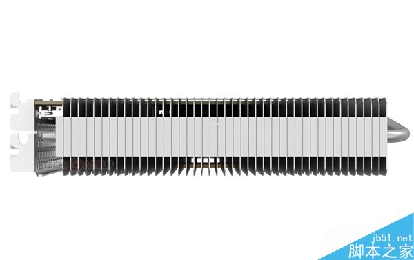 該卡散熱器沒有風扇,而是使用了兩條鍍鎳純銅熱管,貫穿超大體積散熱鰭片,再加上純銅底座來進行散熱,唯一的代價就是需要占用兩個插槽位空間。