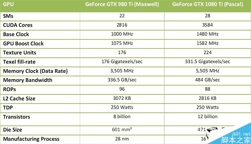 GTX 1080 Ti采用了和Titan X相同的GP102大核心,同樣有3584個(gè)流處理器,分為28組SM(流處理器陣列),相比于GTX 980 Ti 2816個(gè)猛增了27%。