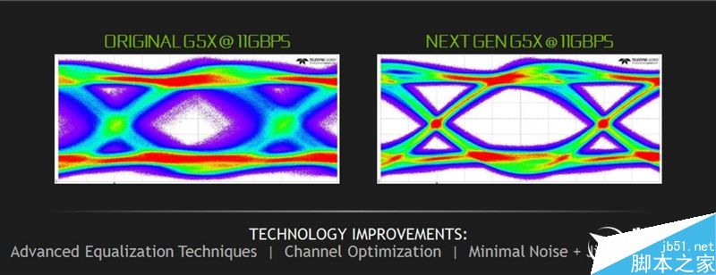 這幅對(duì)比圖中,左側(cè)是原有的GDDR5X跑在11GHz,可以看到信號(hào)圖中央部位有大量雜亂信號(hào),顯然會(huì)干擾數(shù)據(jù)傳呼,而右側(cè)的新一代GDDR5X 11GHz就好多了。
