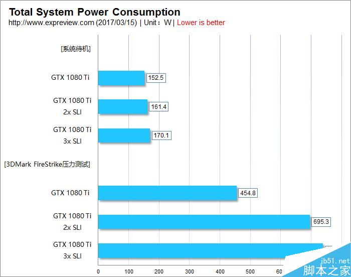 GTX 1080 Ti單卡待機情況下就已經有152.5W,可見CPU的功耗是多么的高,但待機情況下,無論是2x/3x SLI功耗差別不大,大約相差9W左右。