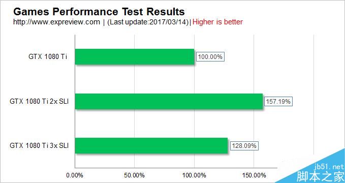 測試結果表明,仍是屬于基準測試的《天堂4.0》依舊在雙路中獲得1.85X的好成績,提升幅度明顯。反觀5款游戲在GTX 1080 Ti單卡、 GTX 1080 Ti 2x SLI、GTX 1080 Ti 3x SLI表現,3x SLI由于沒有驅動支持,成績甚至不如單卡,也就是說,以目前NVIDIA的SLI策略來看,3x SLI已經沒有實際意義,最大作用就是刷刷3DMark名人堂總分榜。2x SLI表現也非常不錯,在《古墓麗影:崛起》比單卡性能提升91%之多,少的話也有DX 12模式下的《殺手6》,雙卡成績僅僅提升10%。
