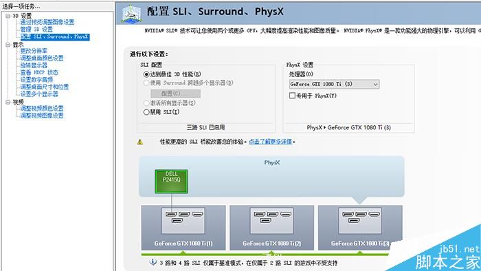 當你正確插入顯卡并安裝好相應的SLI橋,進入系統安裝NVIDIA Geforce驅動后,系統桌面下鼠標右鍵將會出現NVIDIA控制面板,此時我們就可以進入查看SLI是否生效。如果你有多個顯示器,可以設置“使用Surround跨越多個顯示器”,同時還可以指定PhysX物理特效加速使用哪一張顯卡或者是CPU,當然也可以默認為自動選擇。