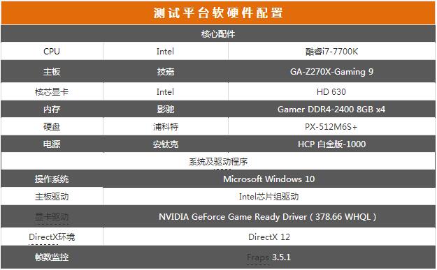 為保證測試能夠發揮顯卡的最佳性能,本次測試平臺采用全新7代酷睿芯——Intel酷睿i7-7700K處理器、技嘉Z270芯片組主板、影馳 Gamer DDR4-2400 8GB 雙通道內存、安鈦克1000w鈦金電源組建而成。詳細硬件規格如下表所示: