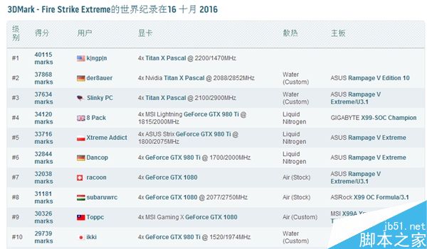 3DMark Fire Strike Extreme是目前最壓榨顯卡性能的一個測試項目,Dancop、Xtreme Addict、8 Pack、Slinky PC、der8auer等眾多高手用盡各種辦法,包括使用四塊GTX 980 Ti或者四塊Titan X,最好成績也只有3.8萬分左右。