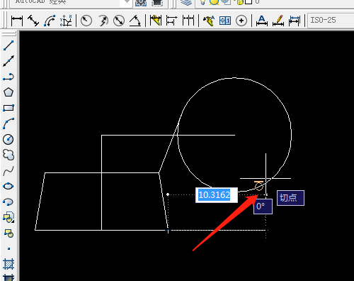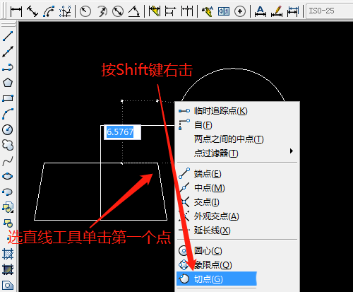 4、單擊直線工具,捕捉第一個點,按Shift鍵右擊選切點,鼠標移動圓邊線上出現切點圖標時單擊,繪制出斜線。