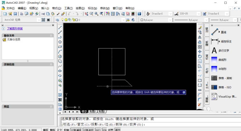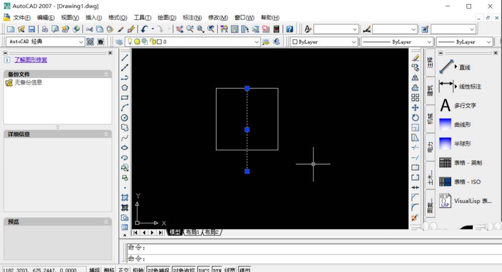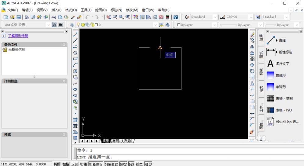 2、使用line命令,通過捕獲矩形邊界中點(diǎn),繪制一條垂直直線,用于后面的鏡像操作。