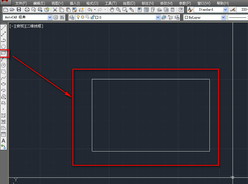 1、打開(kāi)cad,使用矩形工具繪制一個(gè)矩形,如下圖。