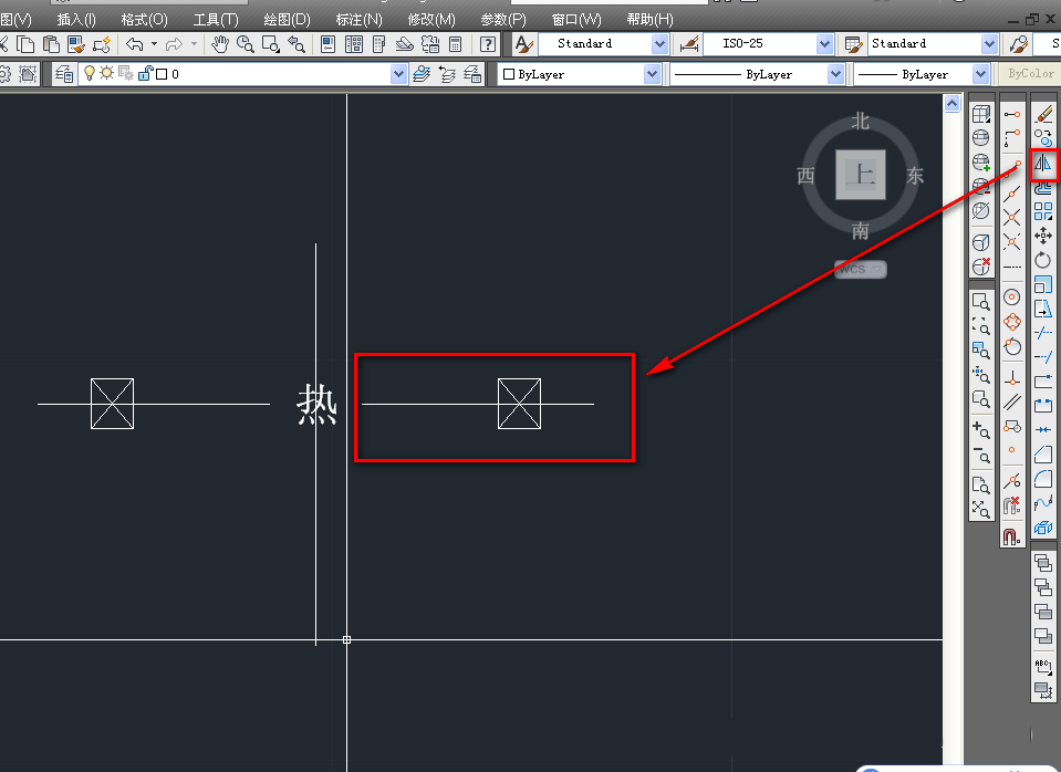 6、使用鏡像工具,將輔助線左側的圖形鏡像到右側,如下圖。