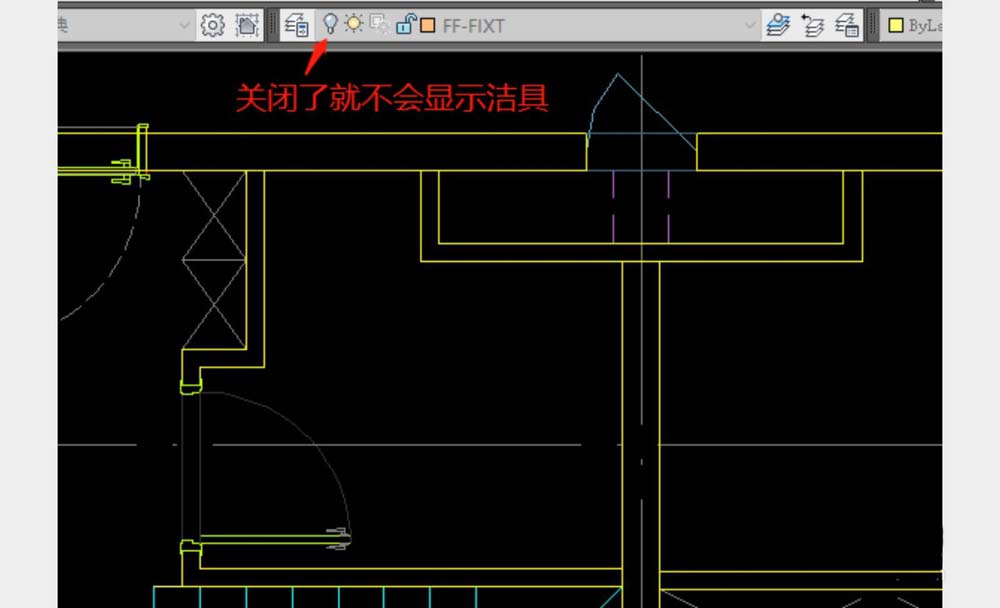 8、比如我們點擊取消顯示潔具,那么潔具就不見了,我們可以打開顯示衛生間的電路水路圖。