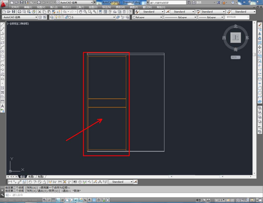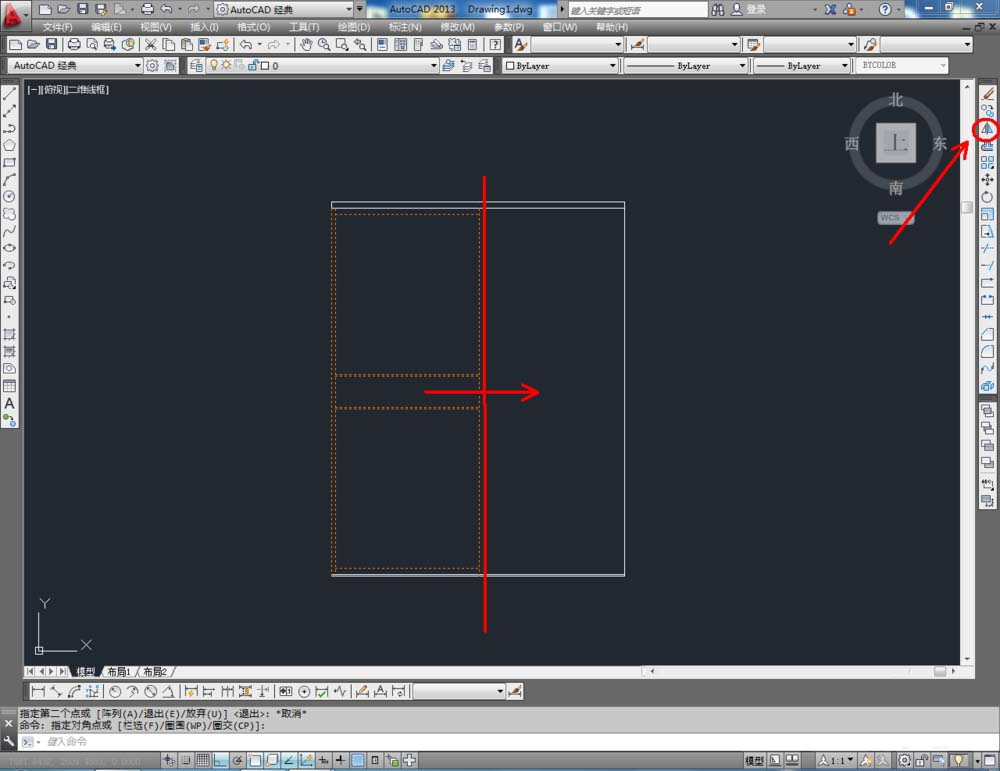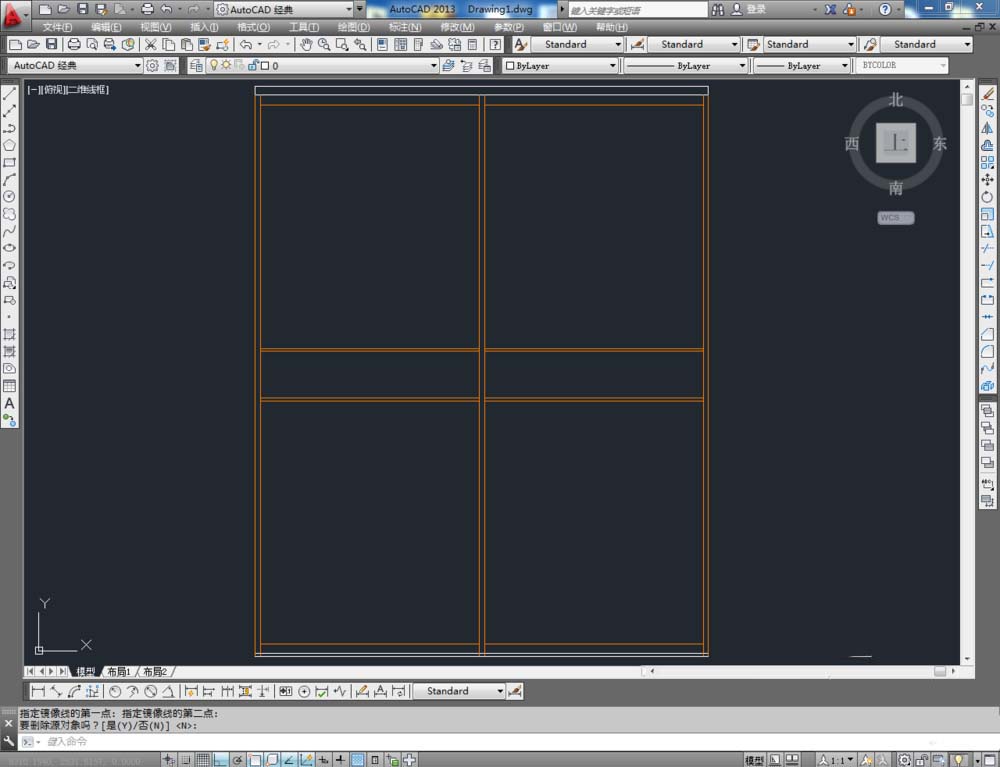 4、選中繪制好的門頁,點擊【鏡像】,將移門門頁沿著柜體中心線進行鏡像操作,繪制出另一個門頁;
