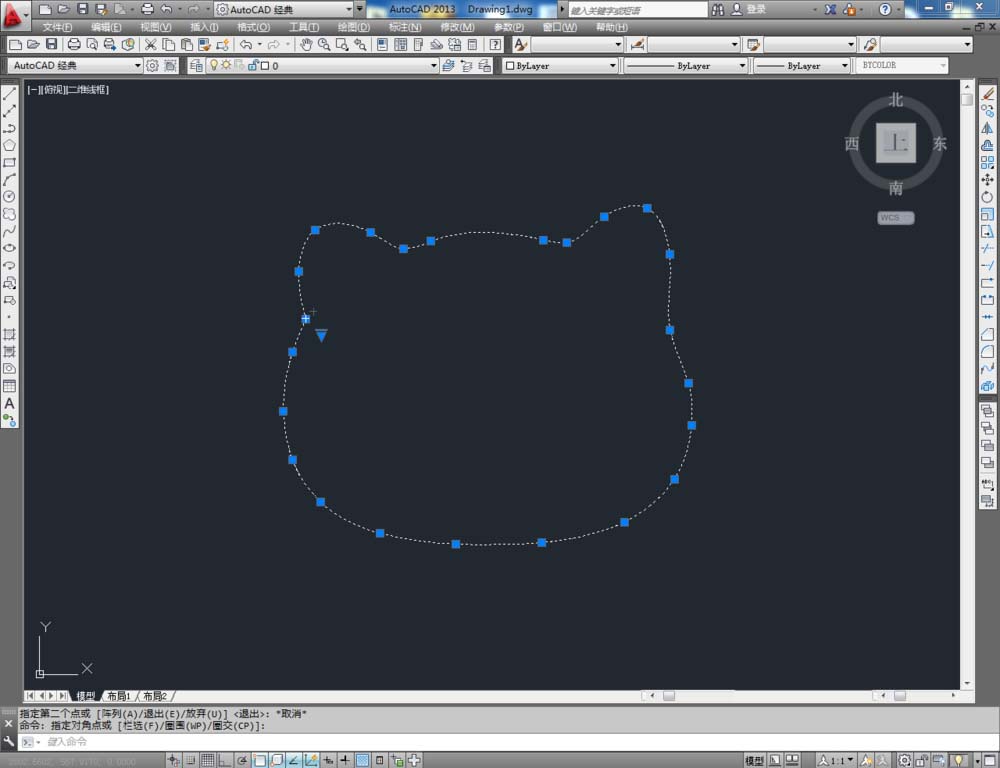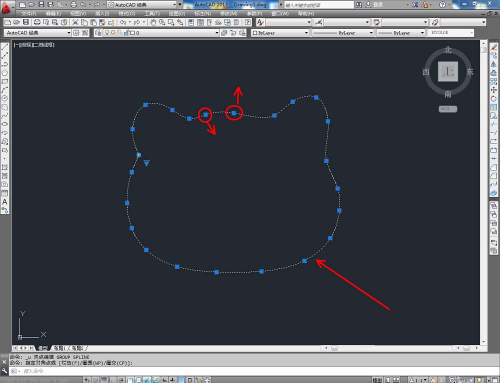 1、打開AutoCAD 2013軟件,點(diǎn)擊【樣條曲線】繪制一個卡通人物頭部輪廓并調(diào)整好輪廓上的各個節(jié)點(diǎn);