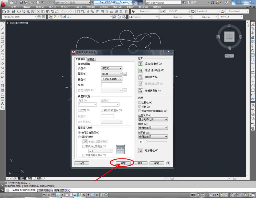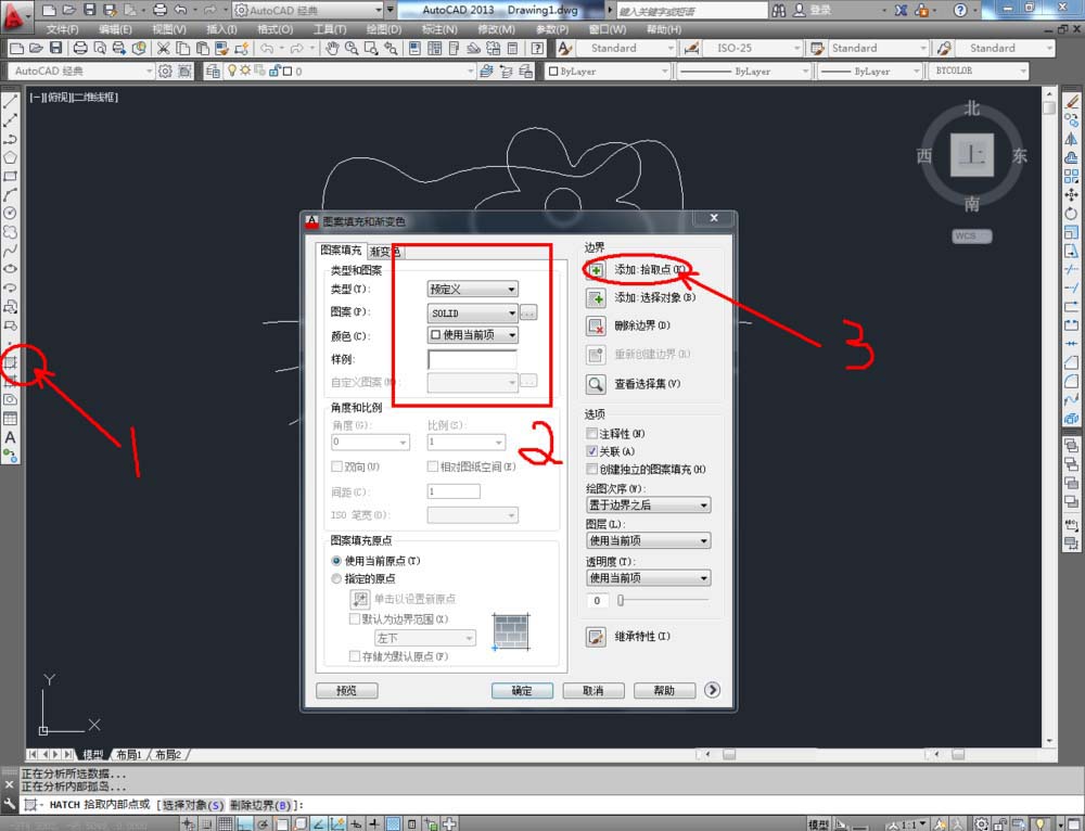 4、點(diǎn)擊左邊工具欄中的【圖案填充】,設(shè)置好圖案填充參數(shù)后,按圖示對各圖案進(jìn)行填充;