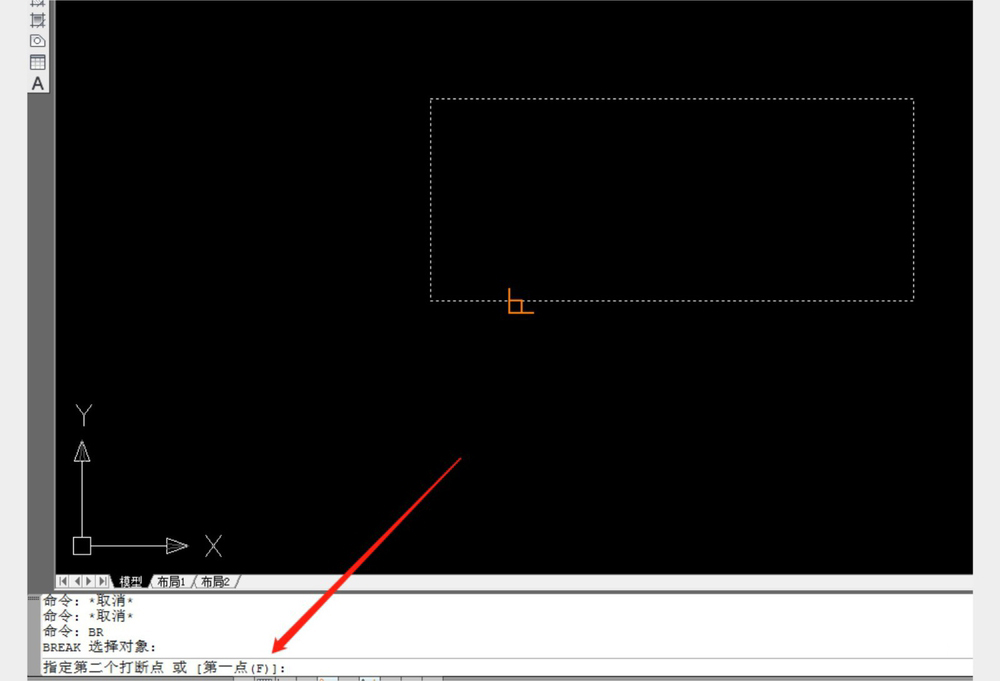 4、在“br”命令下,執行“F”命令,即可自己選擇打斷的第一個點和第二個點。