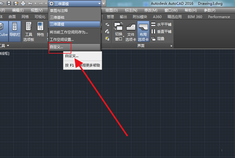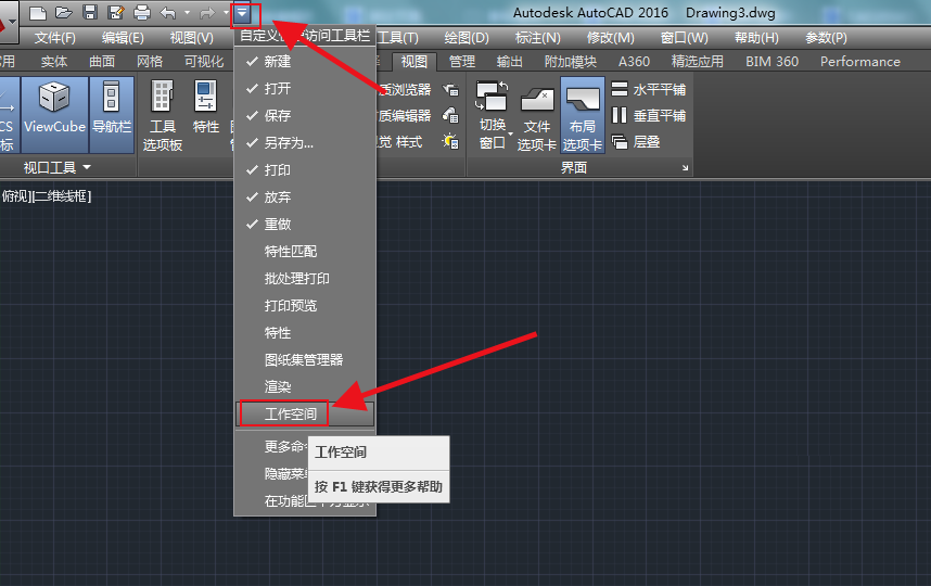 5、然后就會顯示出“工作空間”,當前的選擇是“三維建模”,一般用習慣的是CAD經典。有的話直接切換,沒有就選擇自定義。